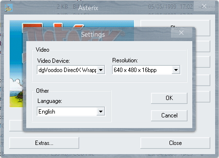 Now, run the “ASTERIXSTART” program from within the Exec folder. Click on “Settings” and make sure that Video Device is set to “dgVoodoo DirectX Wrapper and that “Resolution” is set to “640x480x16bpp”. If you’ve configured everything correctly, the window should look like the one shown below.