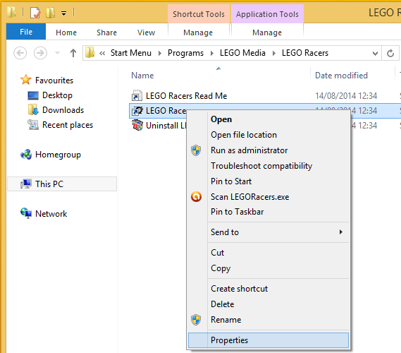 A File Explorer window will then open, right click on the Lego Racers icon and choose “Properties”.