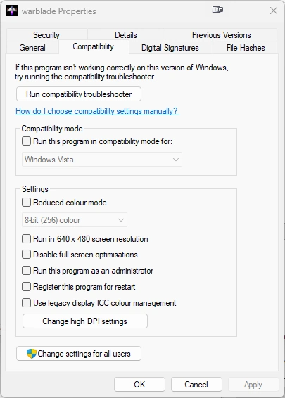 Determining which options to use is often a matter of trial and error. Generally, only very old (pre 2000’s) games need the “640×480 screen resolution” or “Reduced colour mode”. Be careful with the option “Run this program as an administrator” as this gives the program administrative privileges to make changes to any part of your computer.