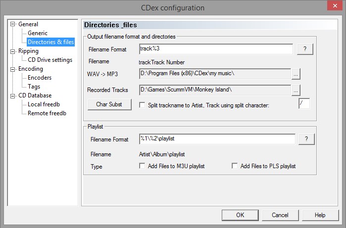 Before you can extract the audio files, there are several options you need to configure. Click on “Options” at the top of the window and then choose “Settings”. A CDex configuration window will then appear. Choose “Directories & files”.