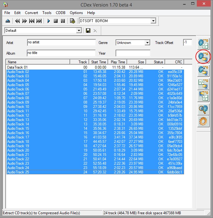Once you have chosen your encoding settings, click on “OK”. The last step is to select all the audio tracks (but not the data track) and then click on the “Extract CD track(s) to Compressed Audio Files” button. Click on the first audio track in the list, then hold down shift and click on the last track to select them all, then click on the second button from the top on the button bank on the right of the window. The button is circled in red in the picture below (click on the picture to enlarge it).