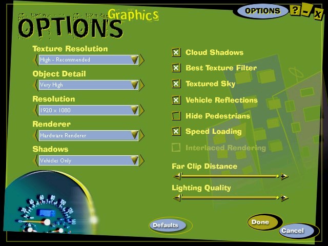 With the video.cfg file patched, you can go ahead and start Midtown Madness again. There are a few in-game visual settings you might want to change before you start playing. From the main menu, go to “Options” and then “Graphics Options”. The screen shown below should then appear.