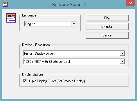 Under “Device / Resolution”, check that “Primary Display Driver” is selected at the top. In the box below, select the resolution to run the game at. Generally you can choose the highest possible if your display supports it. Make sure to select a mode with “32 bits per pixel too”. Rollcage Stage 2 is a 4:3 aspect ratio game and so may appear stretched if you force it into a widescreen aspect ratio. We also recommend selecting the “Triple Display Buffer” option.