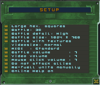 On a modern PC, you should set “Large hex. squares”, “Battle detail: High” and “Battle size: 1024×768”. The other options can be set to taste. Even with the largest Hex squares, the map may be difficult to see on a modern monitor. If so, exit the game and then change your desktop screen resolution to something smaller. Then, start the game again.