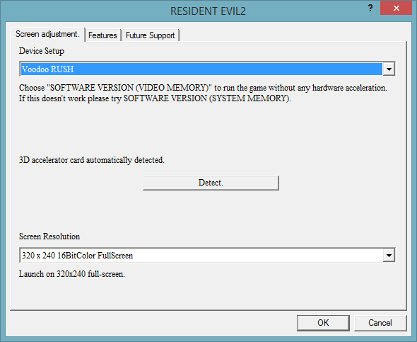 Had the same problem on my netbook with Intel GMA 3600. Downloaded a patch for the sourcenext version (Bio2.exe – less than a MB) and ran that. Next time I ran the Resident Evil 2 config and hit “detect” it let me choose “software” which solved the problem and let the game run.