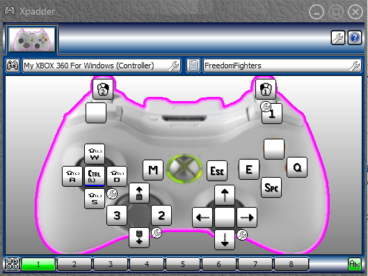 For movement, we used Xpadders Distance Zone feature. Since Chris will walk if the shift key is pressed down, but run otherwise, we configured the left analogue stick so that the shift key was sent along with the directional key unless the stick was pushed 75% of the way down or more. For a more detailed explanation of distance zones, check out our Youtube video here. You can also click this stick to toggle crouching.