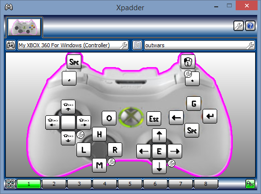 Since the game lets you hold down the Shift key to make your character walk rather than run, we made use of Xpadders Distance Zone feature to facilitate the two speeds of movement on the left analogue stick. Pushing the stick less than 80% of the way will make the character walk (shift+direction) while 80% or more makes you run. For a tutorial on how Distance Zones work and how you can configure them, click here.