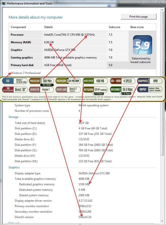 On the window that now appears, you can check your computers specs against those listed for the game. Below is a picture of the window open, with the above system specs overlaid on top, so you can see where the different pieces of information match up:-